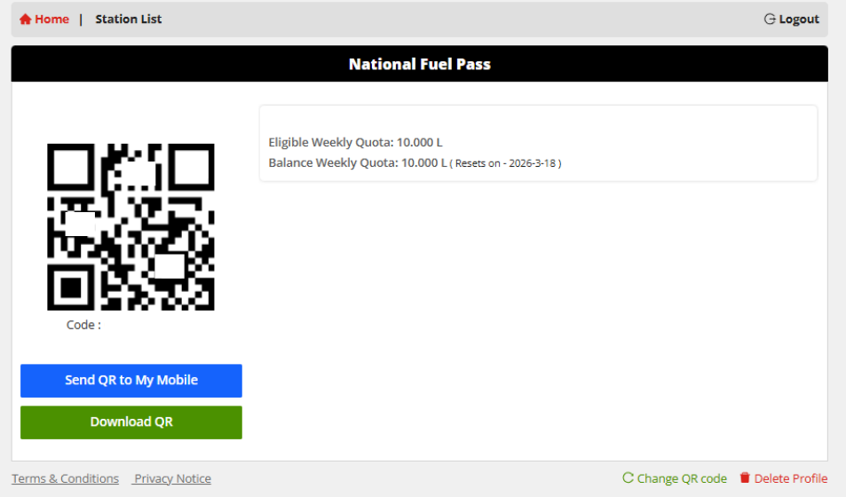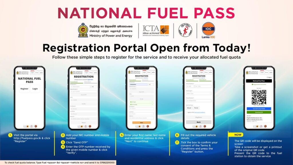 The National Fuel Pass system in Sri Lanka, relaunched on March 15, 2026, requires vehicle owners to register at fuelpass.gov.lk to receive a QR code for weekly fuel quotas.