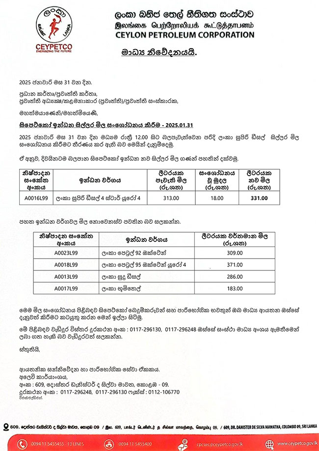 The Ceylon Petroleum Corporation (CPC) has announced a revision of fuel prices effective from midnight 31st January 2025.